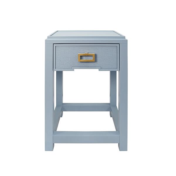 The Jean Nightstand by Worlds Away is a refined bedside storage solution designed to elevate any bedroom. Finished in a glossy light blue lacquer, it features clean lines, elegant metallic hardware, and multiple drawers for functional storage.