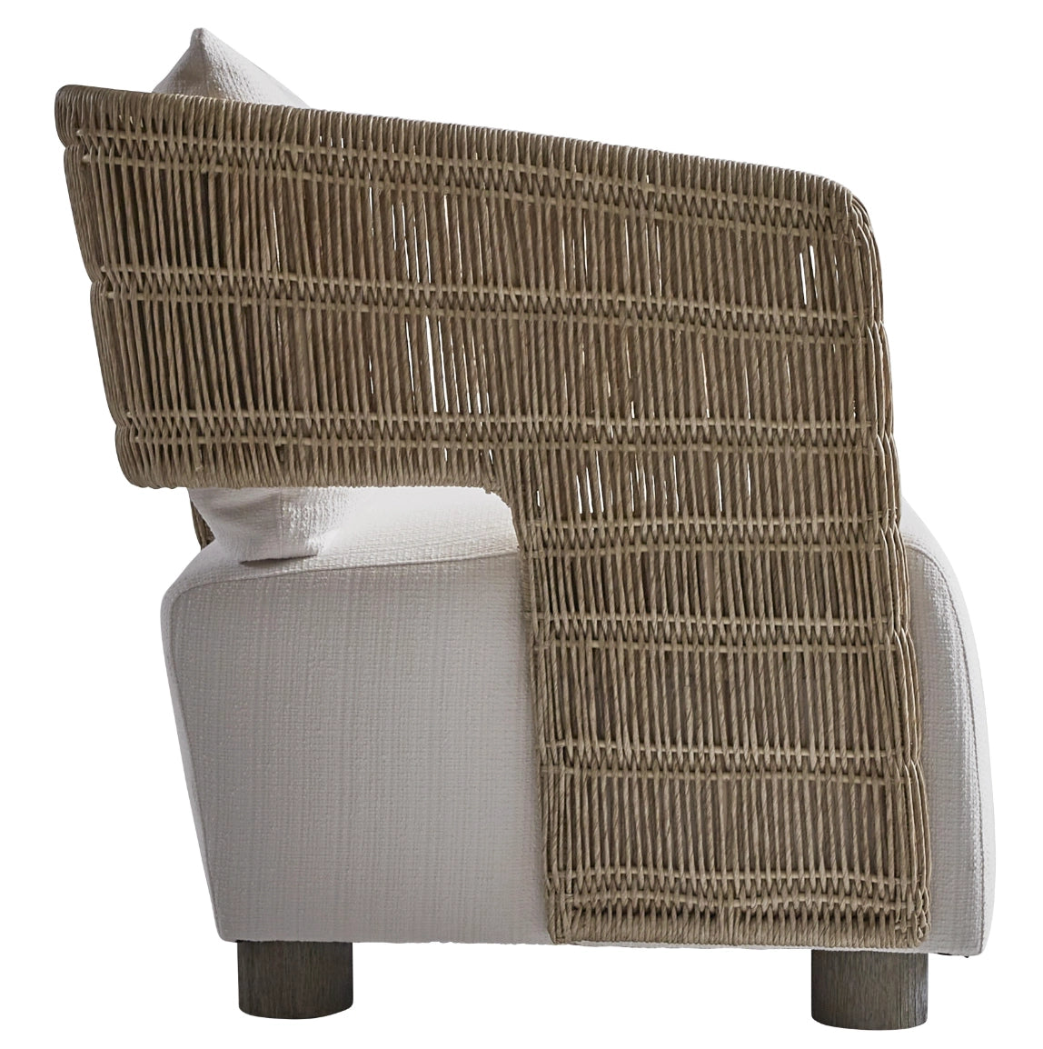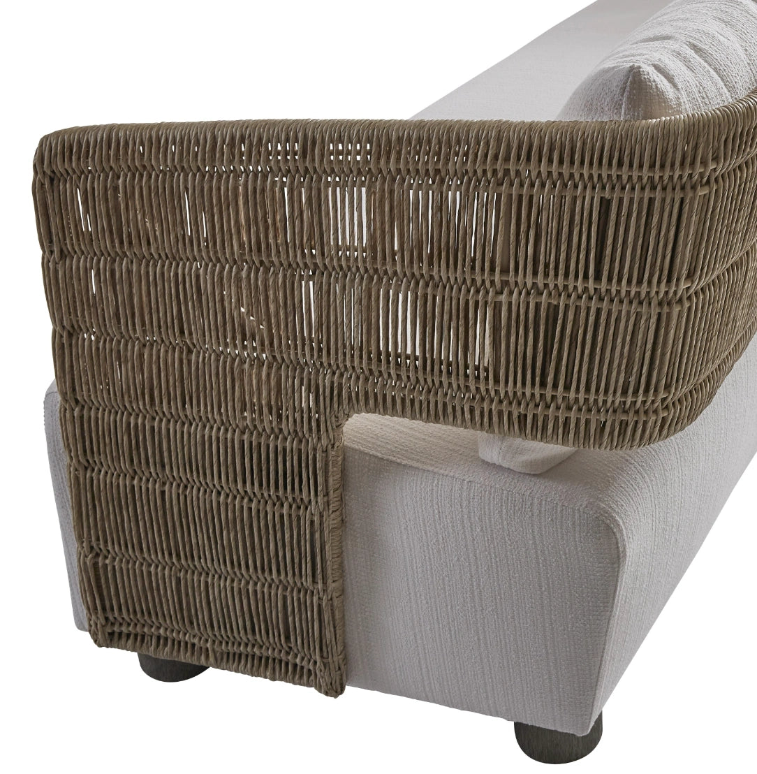 The Bernhardt Maldives Outdoor Sofa showcases a unique frame crafted in twisted abaca all-weather wicker, forming the arms and back into a sculptural silhouette. Paired with plush performance fabric cushions, this sofa blends organic texture with outdoor durability. Perfect for patios, poolside lounges, and terraces, it delivers both coastal charm and modern elegance.
