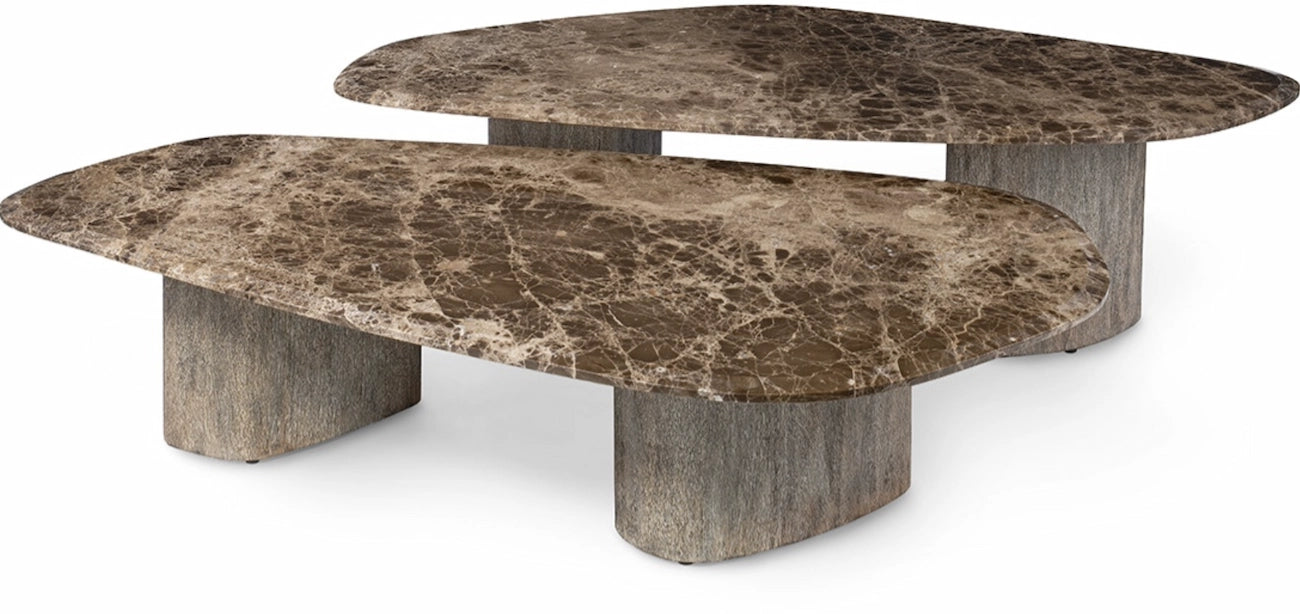 The Palecek Caleb Coffee Table Tall, Brown showcases a solid Emperador marble tabletop imported from Spain, with stunning natural variations of brown, cream, and ivory tones. Supported by wire-brushed hardwood legs, this elegant piece blends luxury stone with organic wood detailing. Because marble is a natural material, color and grain will vary, ensuring that no two pieces are alike. A refined statement table for sophisticated living spaces.