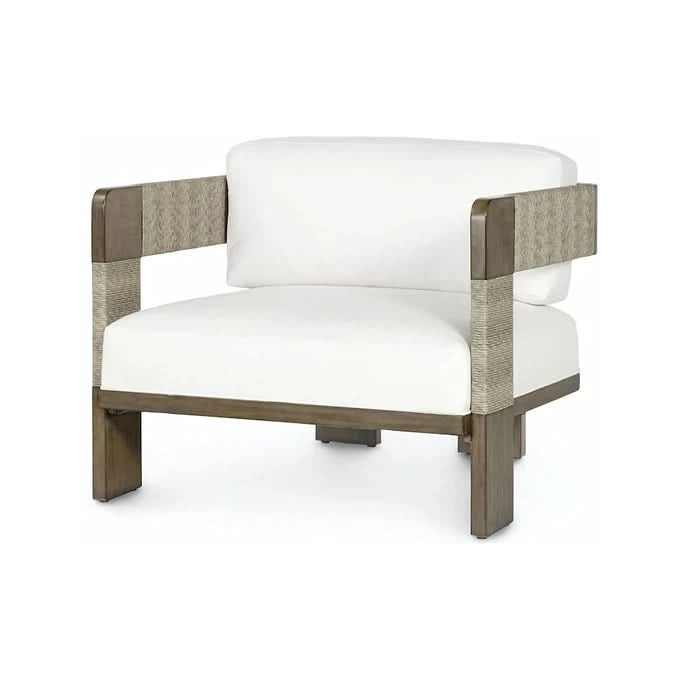 Kirk Nix Collection. Solid hardwood frame in a coffee brown finish accented with hand-twisted all-weather synthetic abaca in a cream-taupe two tone finish. Chair comes with a fixed upholstered seat and a loose back cushion.