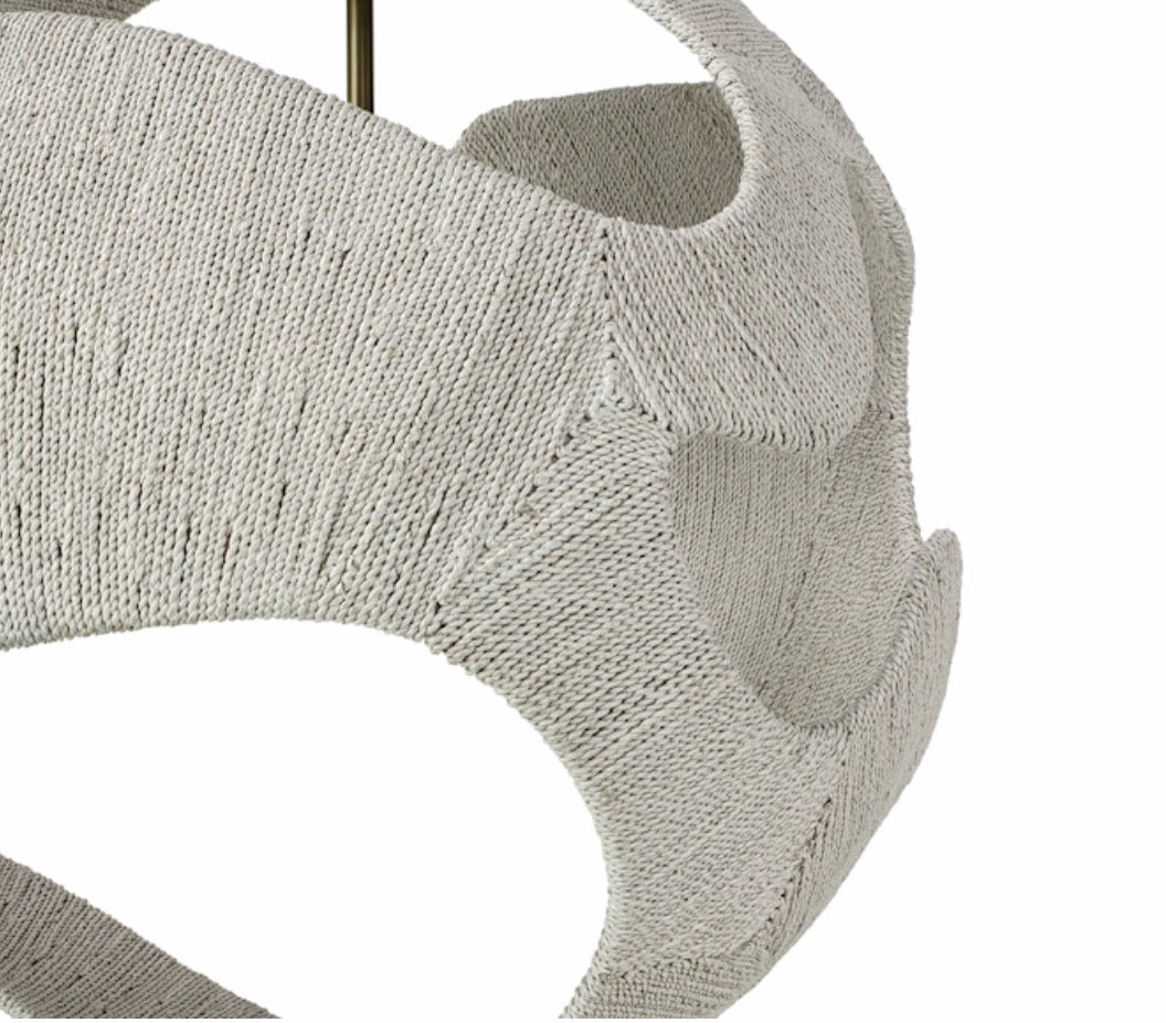 The Corsica Pendant Large in White showcases hand-woven lampakanay rope in a soft whitewash finish, gracefully wrapped over an abstract powder-coated metal frame. This fully adjustable pendant includes an antique brass canopy hanging kit with multiple rods for customizable hanging heights. Finished with a large porcelain globe bulb for a warm, ambient glow. Professional installation recommended.