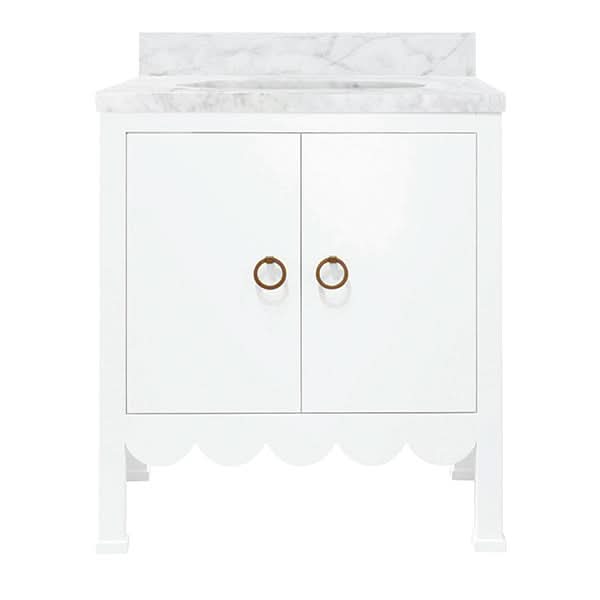 The Kealey Vanity by Worlds Away is a sophisticated bathroom centerpiece that combines timeless design with everyday function. Finished in a glossy white lacquer and topped with a luxurious marble countertop, it features refined metallic hardware and ample storage space.