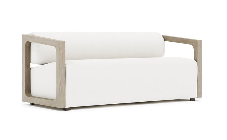 The Bernhardt Leilani Outdoor Sofa showcases asymmetrical teak squares that create a striking sculptural frame, supporting a shapely silhouette designed for modern outdoor living. Plush performance fabric cushions provide durability and comfort, making it ideal for patios, terraces, and poolside lounges.