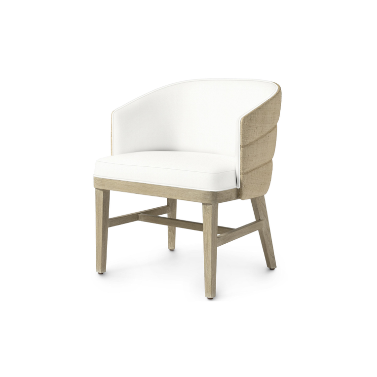 Cerused oak wood legs and frame featuring natural raffia layered tufting on the outside back accented with hand-twisted abaca rope details. Raffia is a natural material that may vary in color and texture. Chair comes with a fixed upholstered seat.