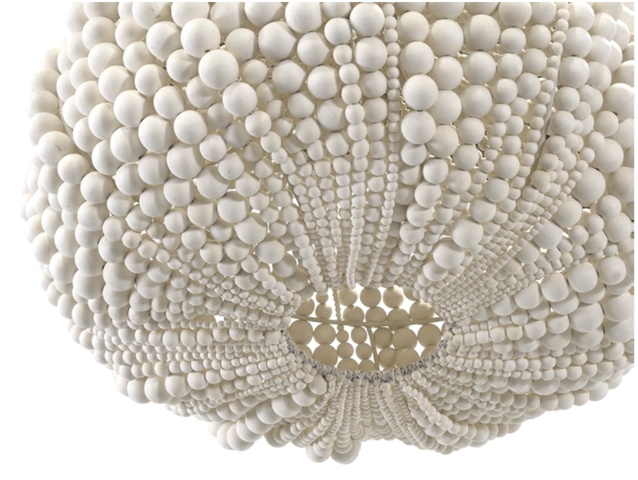 The Palecek Point Dume Pendant is a handcrafted lighting fixture featuring wood spheres in a cream finish, carefully hand-sewn together over a sturdy metal frame. Completed with an off-white finished chain and coordinating canopy hanging kit, this pendant light adds natural charm and coastal-inspired elegance to dining rooms, kitchens, bedrooms, or entryways.