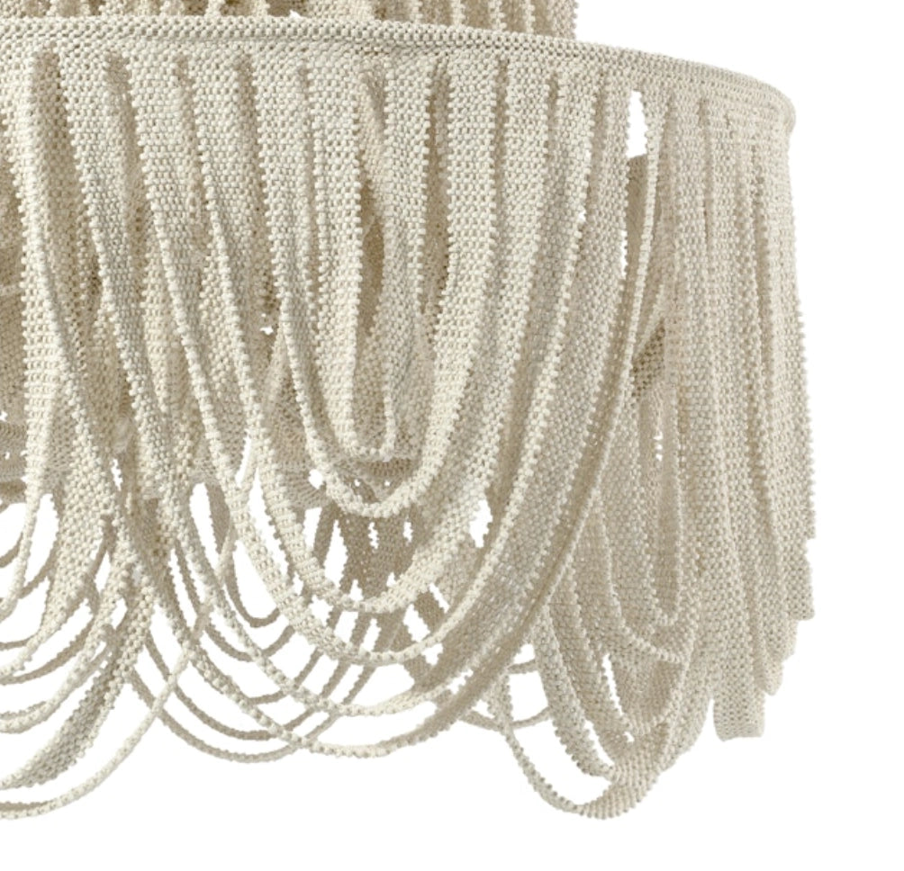 The Palecek Selita Oversized Chandelier is a dramatic statement fixture featuring tiny coco beads hand-sewn into flowing ribbons, suspended from powder-coated layered metal frames. Completed with an off-white finished chain and canopy hanging kit, this chandelier brings elegance and natural texture to large spaces. ⚠️ Note: Lighting fixtures weighing more than 50 lbs. cannot be mounted directly to a standard ceiling junction box and may require additional ceiling brace support. Professional installation is recommended.